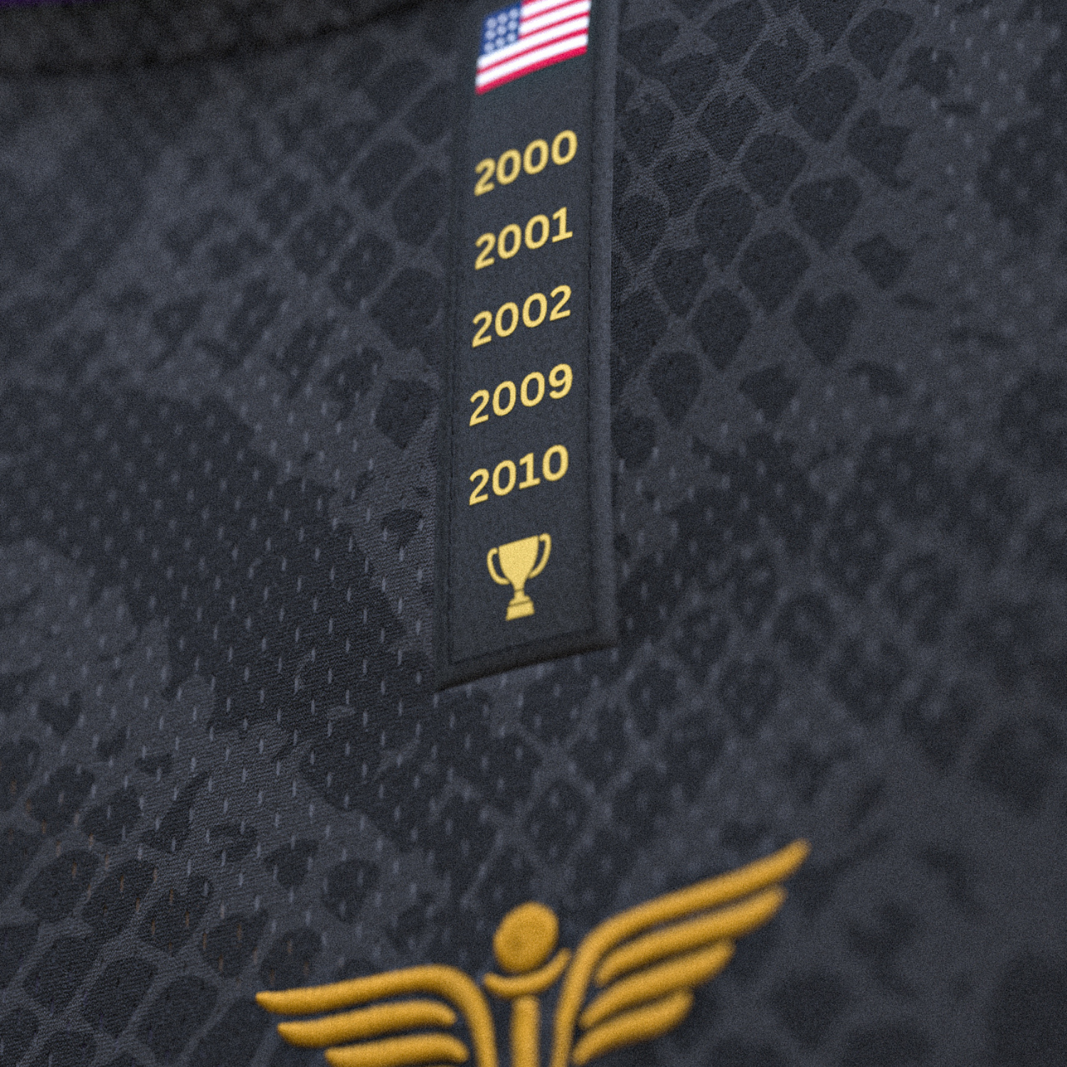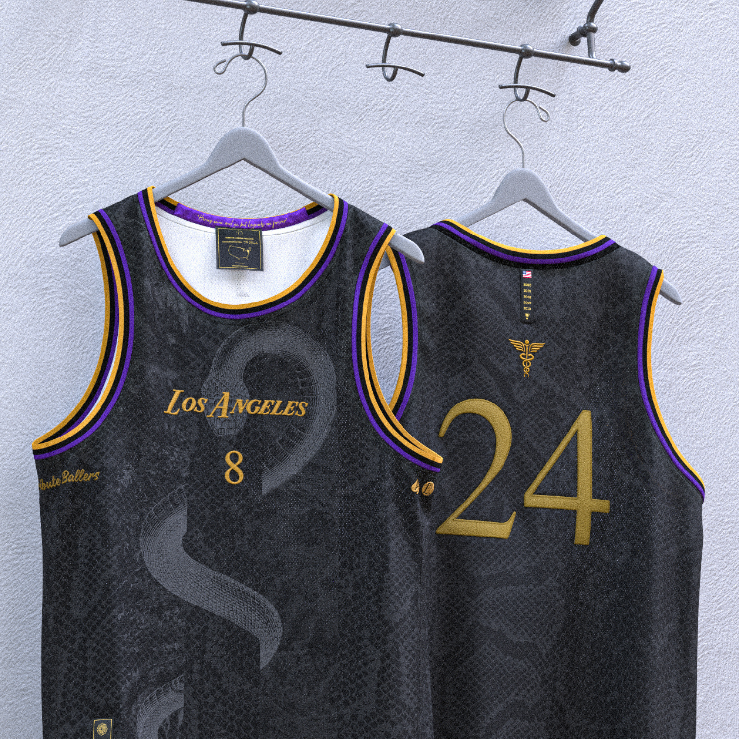 ‘Los Angeles’ fully embroidered in gold across the chest. Bold and unapologetic. Beneath it, a black mamba pattern runs through the premium polyester fabric, a subtle nod to the mindset that made him deadly.